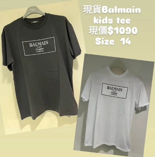 現貨Balmain kids tee 現價$1090 Size 14 建議可先Whats app 60159909 跟店員查詢存貨/碼數狀態及最新價格。 下單後同事會聯絡跟進訂單,下單前請註明尺碼。 如需要包裝例如:盒、紙袋等,請購買前詢問清楚,一般現貨沒有專門店紙袋! 包郵順豐(只限香港地區順豐站/👉🏻智能櫃) /尖沙咀或深水埗地鐵交收(就時間)/ 尖沙咀門市只供取貨 (要預約)
