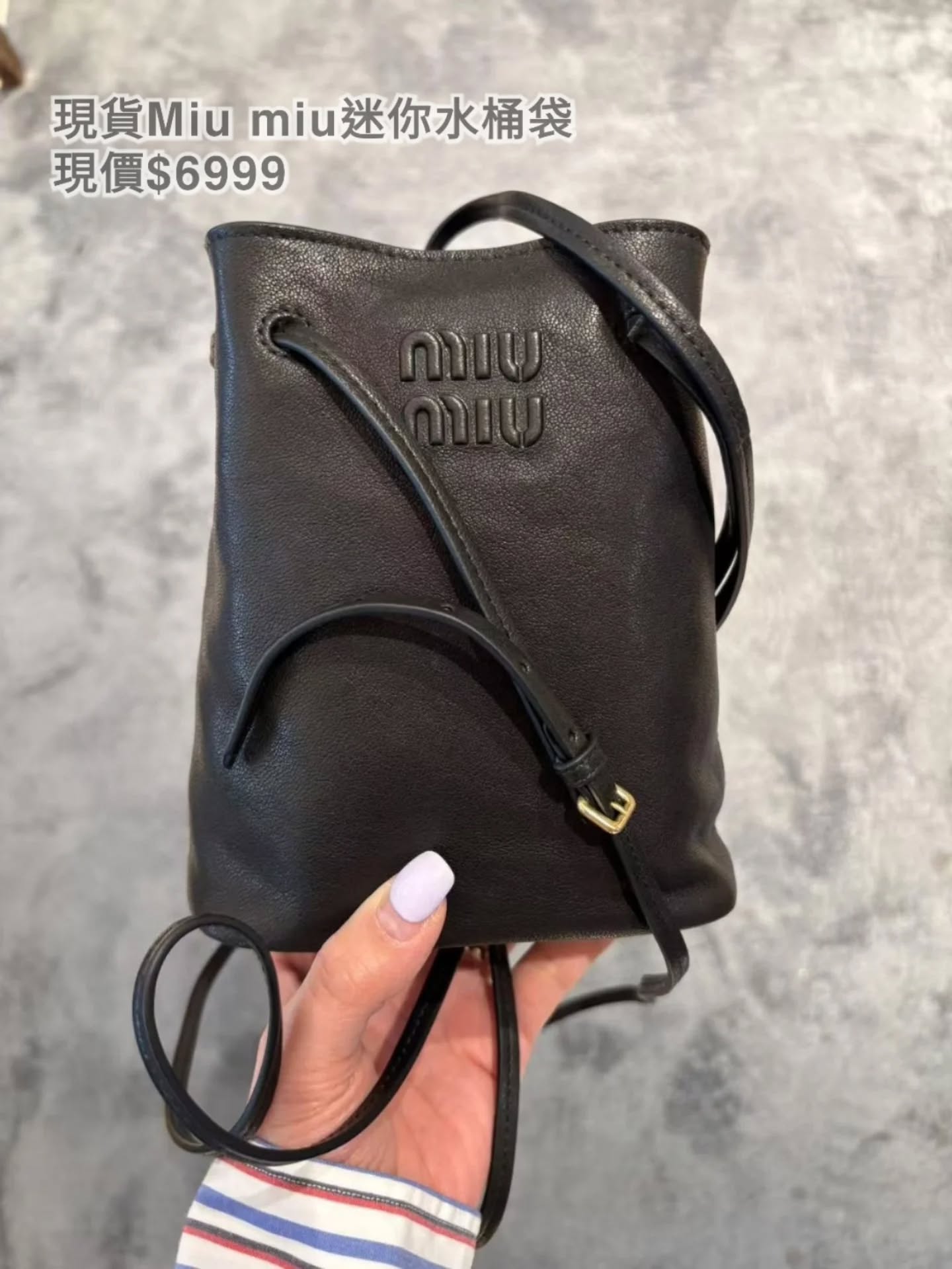 現貨Miu miu迷你水桶袋 現價$6999 建議可先Whats app 60159909 跟店員查詢存貨/碼數狀態及最新價格。 下單後同事會聯絡跟進訂單,下單前請註明尺碼。 如需要包裝例如:盒、紙袋等,請購買前詢問清楚,一般現貨沒有專門店紙袋! 包郵順豐(只限香港地區順豐站/👉🏻智能櫃) /尖沙咀或深水埗地鐵交收(就時間)/ 尖沙咀門市只供取貨 (要預約)